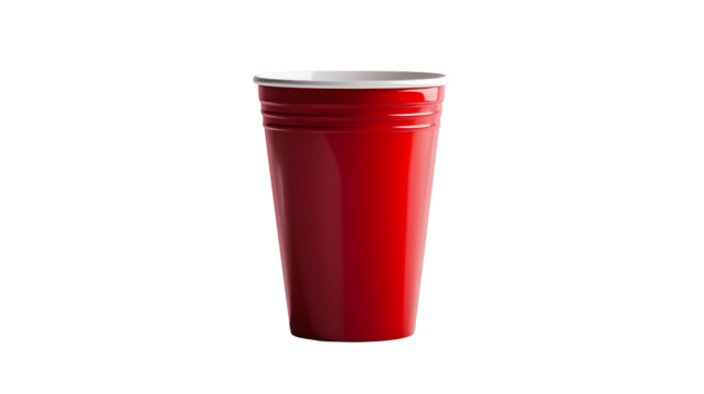 A vibrant red plastic cup with a white rim stands out against a transparent background, perfect for illustrating party themes, beverage containers, or casual drinkware in various design projects.