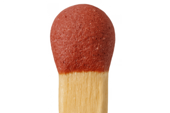 Close-up of a matchstick with a red head, symbolizing ignition, potential, start, and new beginnings on a transparent background