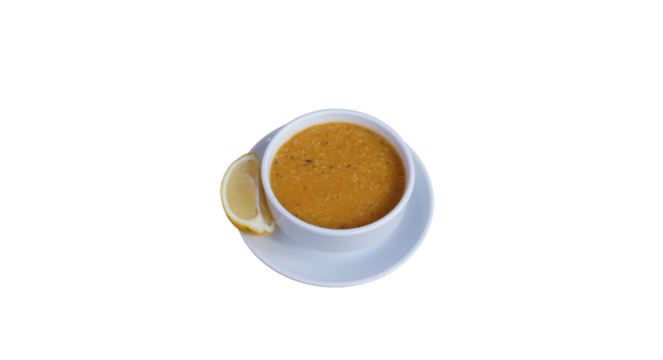 Tomato Soup with basil leaf in a white bowl isolated on transparent background.