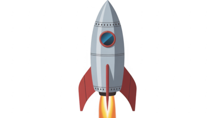 A red, white, and chrome retro rocket ship with a blue window, blasting off