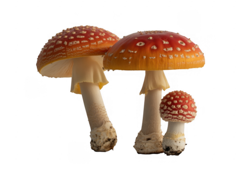Three red and white spotted Amanita muscaria mushrooms isolated on a transparent background