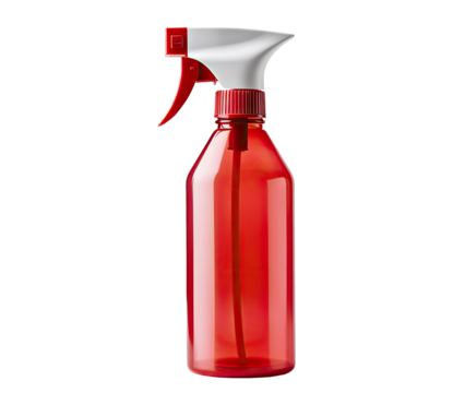 Red Spray Bottle With Liquid. Cleaning And Disinfection Concept Isolated On Transparent Background