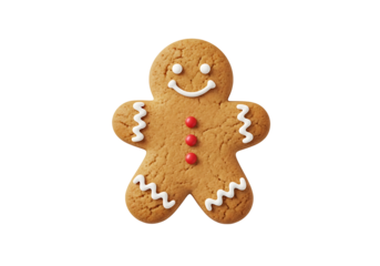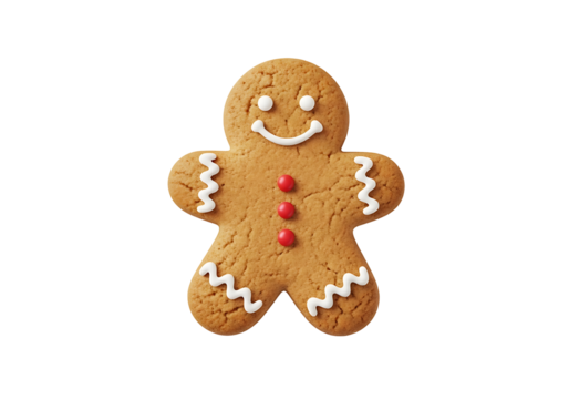 A gingerbread man cookie, decorated with white icing and red sprinkles, stands out against a black background.