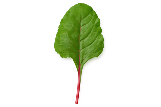 Single green leaf with red stem, isolated on transparent background, showing clear venation