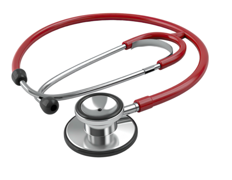 Red stethoscope, a medical instrument used for listening to internal body sounds, isolated on transparent background