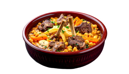 A delicious and hearty bowl of red stew with meat and potatoes, on a transparent background.