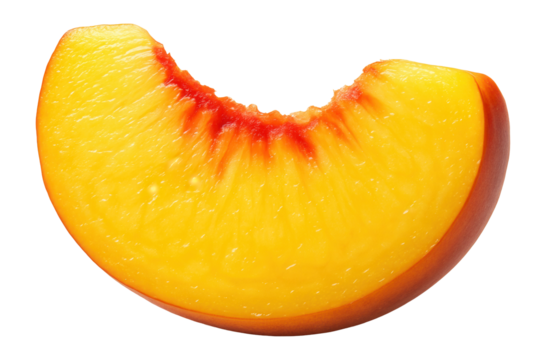Ripe juicy yellow peach slice with red streaks on white background.