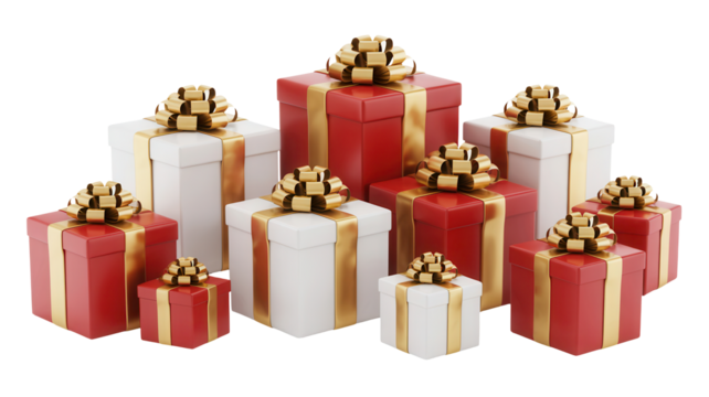 A festive collection of assorted sized red and white striped gift boxes with golden bows isolated on transparent background