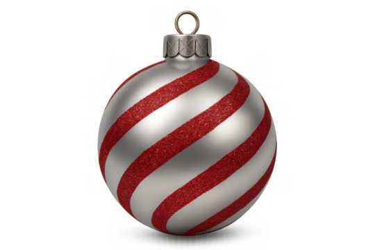 Silver christmas ball ornament with red stripes and transparent background, perfect for holiday projects