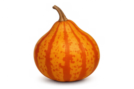 Studio shot of a decorative gourd with vibrant orange and red stripes, isolated on a transparent background, perfect for autumnal designs