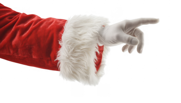 Santa Claus arm in red and white suit pointing hand red suit isolated on a transparent background
