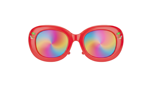 Vibrant red sunglasses with rainbow lenses in a 3D rendering against a white background