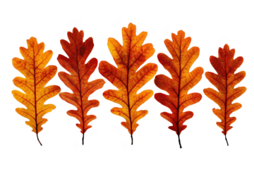 Five autumn oak leaves in shades of orange and red isolated on a transparent background fall leaf