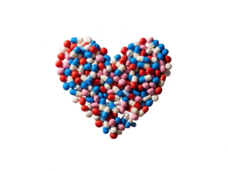 Colorful red, white, and blue candy pills in a heart shape isolated on transparent background