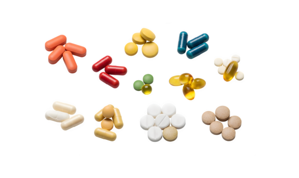 Four glass bottles filled with assorted colorful pills and capsules, isolated on transparent background