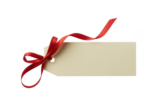Blank gift tag with red ribbon isolated on a transparent background