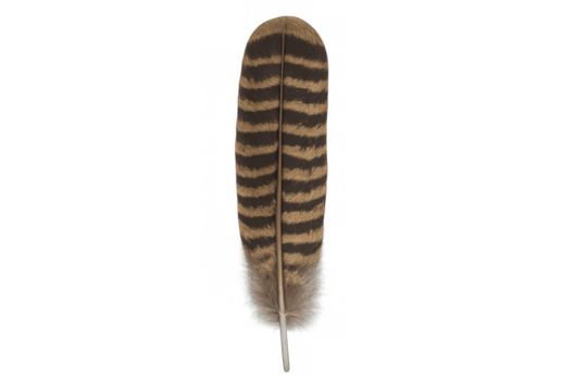 Detailed macro shot of a red-tailed hawk feather isolated on transparent background, showcasing its intricate stripes and delicate calamus