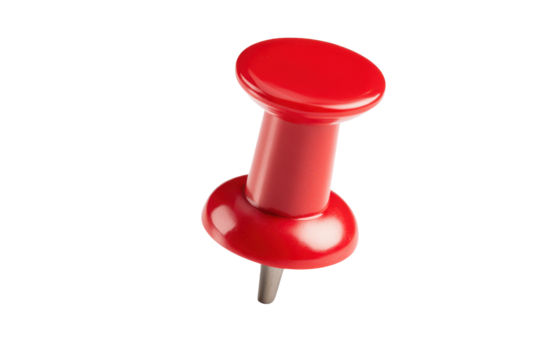 Single red thumbtack isolated on transparent background. Red push pin isolated on white background.
