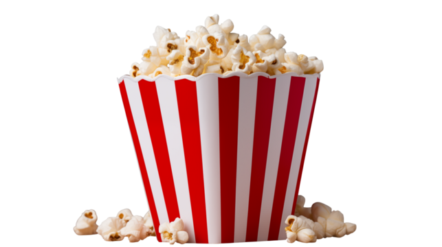 popcorn spilling out of striped red and white popcorn boxes, isolated on a transparent background in PNG format.