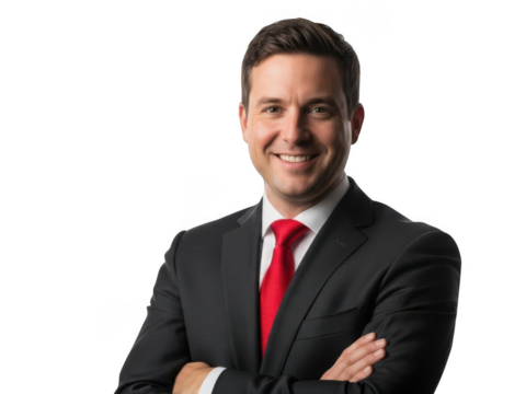 Confident businessman standing with arms crossed, smiling at camera, wearing navy suit and red tie, isolated on white background, high fidelity portrait.