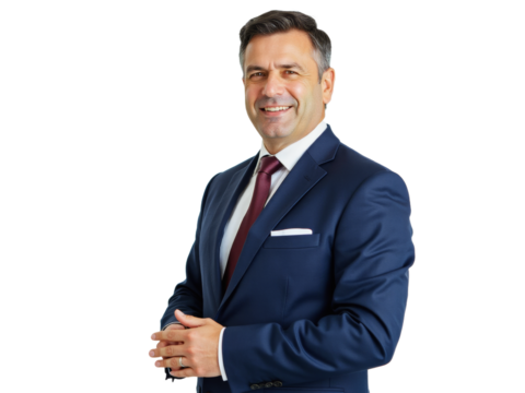 Business portrait isolated on white transparent background: A smiling middle-aged man in a navy suit and red tie confidently poses against a neutral gray background, exuding professionalism and trus