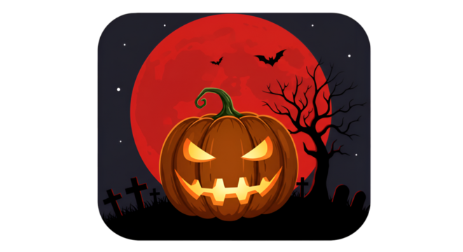 Pixel Illustration of Spooky Halloween Pumpkin with Bats and Full Moon