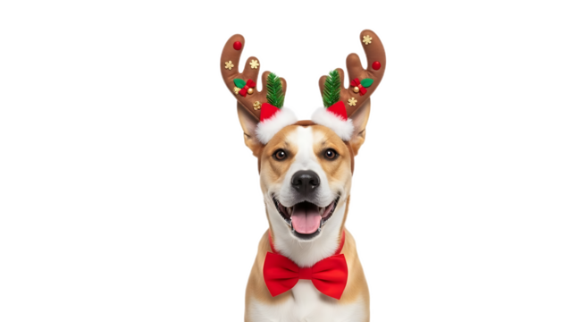 White dog wearing Santa hat smiling with tongue out on a transparent background PNG image