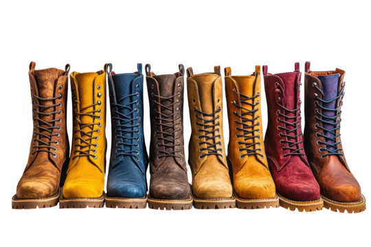 Variety of colorful boots arranged in a row showcasing different styles and colors for fashion enthusiasts