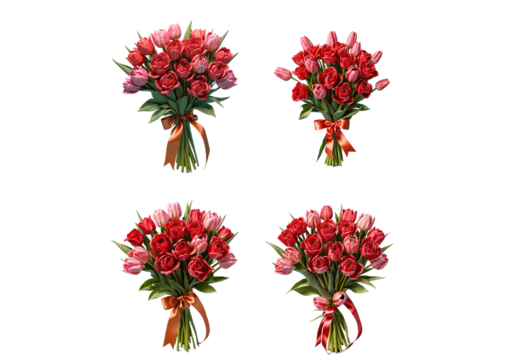Elegant bouquets of pink and red tulips tied with satin ribbons, isolated on a transparent background. Ideal for Valentine’s Day, weddings, celebrations, and romantic-themed designs.