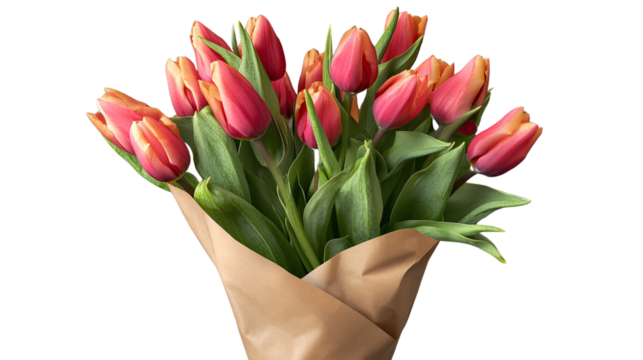 A beautiful bouquet of pink and red tulips isolated against a white background, showcasing the vibrant colors of spring
