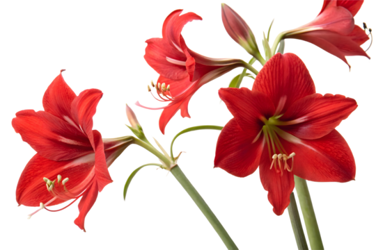 Three vibrant red tulips with green stems and leaves, symbolizing spring, romance, and celebration, transparent background