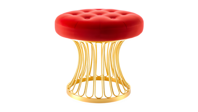 A stylish red upholstered stool with a gold wire frame, featuring a button-tufted top design.
