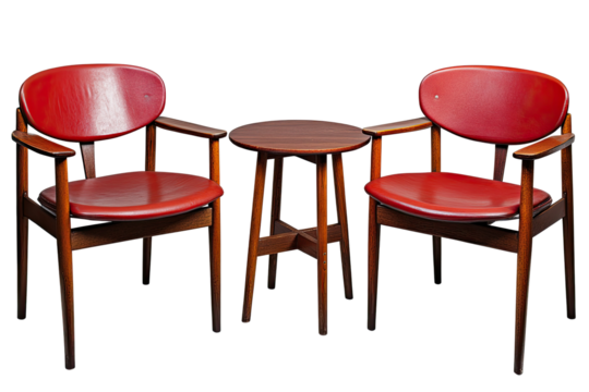 Two red upholstered chairs and a small table
