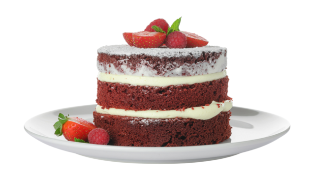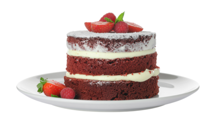 Rich red velvet cake garnished with fresh strawberries and raspberries on a white background
