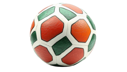 Isolated soccer ball with red, green, and white panels on a transparent background Concept of sports, recreation, and international games