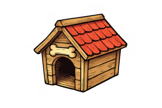 Wooden doghouse with red roof and bone sign providing pet shelter, illustrating animal care and home comfort