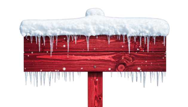 Classic red and white striped North Pole directional sign with wooden post isolated on transparent background PNG