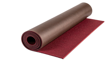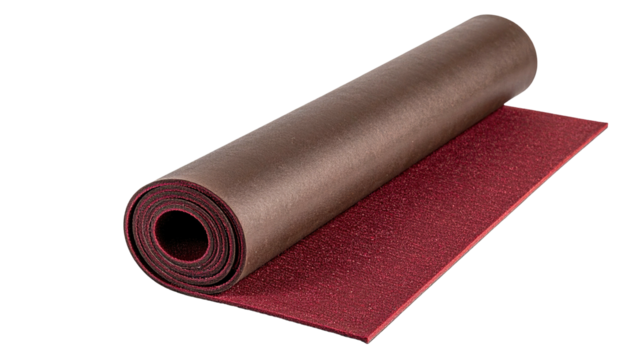 Rolled yoga mat, brown top layer, red base. Black backdrop