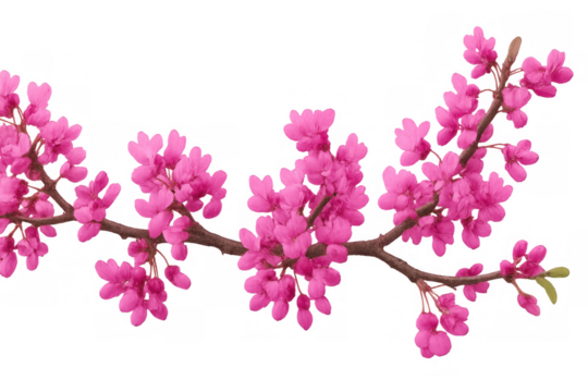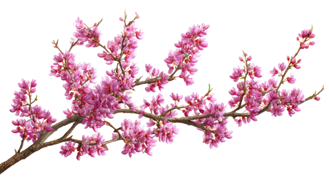Eastern redbud branch displaying delicate pink blossoms, vibrant spring flowering highlighting botanical beauty against transparent backdrop