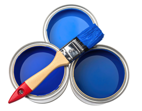 Three paint cans of deep blue, with a paintbrush in between, on a plain background