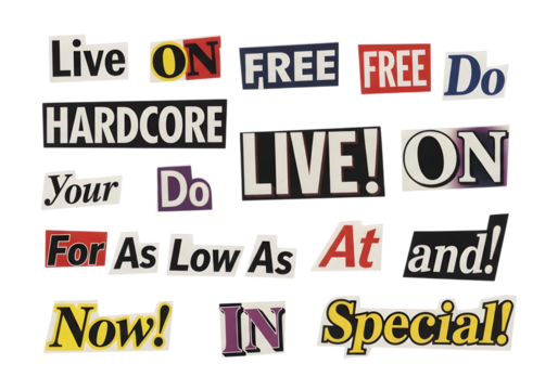 Collage of cut out newspaper letters spelling out various words and phrases isolated on transparent background. ideal for ransom newspaper note