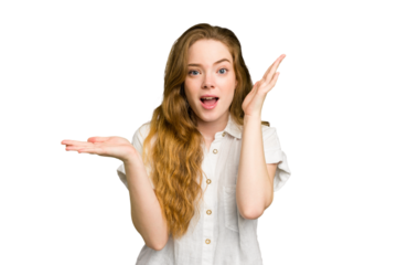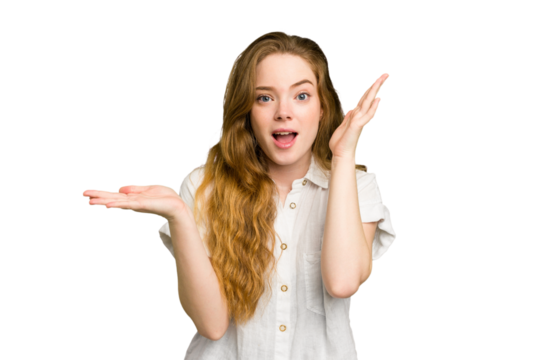 Young caucasian redhead woman isolated holds copy space on a palm, keep hand over cheek. Amazed and delighted.