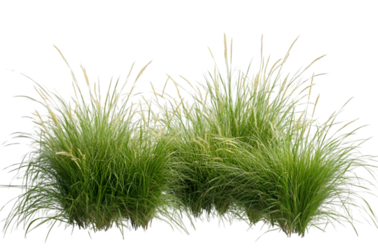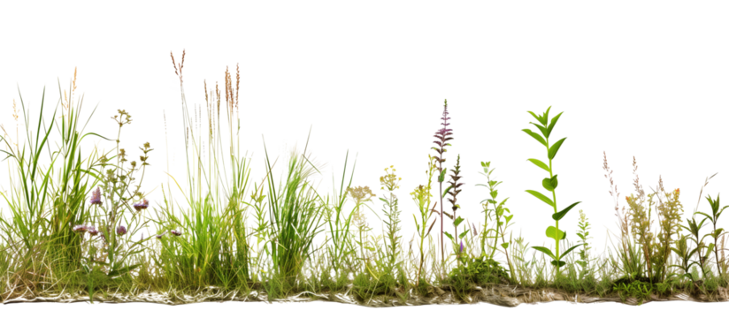 Gradient of grass heights ranging from low-growing thyme to tall feather reed grass, showcasing ecological succession, isolated on transparent background