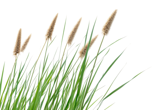 Delicate cattail and reed plants stand tall against a pristine white background, showcasing their vibrant green stalks and soft, feathery tufts