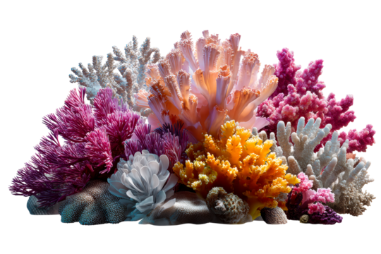 Vibrant artificial coral reef ecosystem with diverse colors isolated on transparent background
