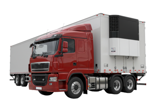 Isolated Semi-Trailer Truck, Red Cab and Refrigerated Trailer, No Backdrop for Easy Compositing
