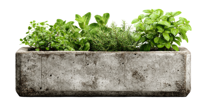 Gray concrete herb planter with various fresh herbs