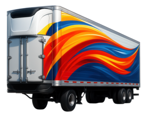 Reefer trailer featuring bright side graphics and robust rear locks.