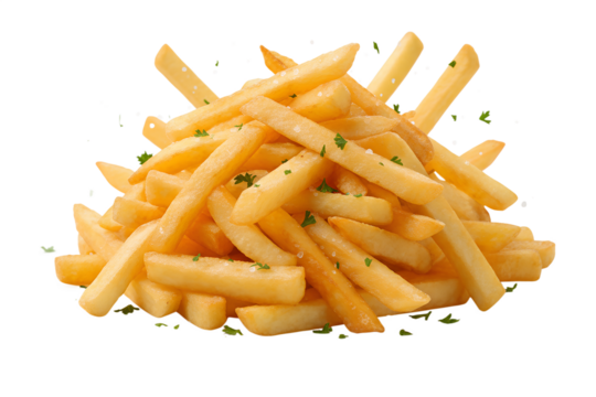 Golden crispy French fries pile isolated on transparent background, fresh fried potato sticks with salt and herbs, delicious fast food snack, crunchy texture, comfort food for menus and advertisements