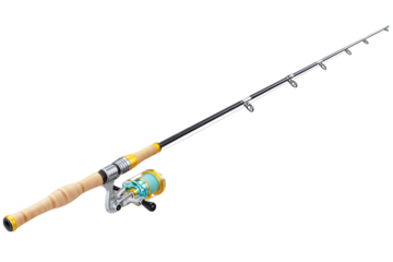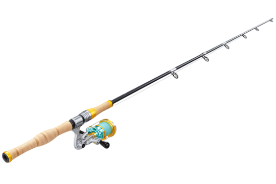Fishing rod and reel, cork grip, and yellow fishing line detailed